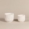 נרות ריחניים בכלי קרמיקה לבנים מעוצבים עם טקסטורה מחוספסת גסה, קו מעוגל ופס רוחבים.